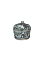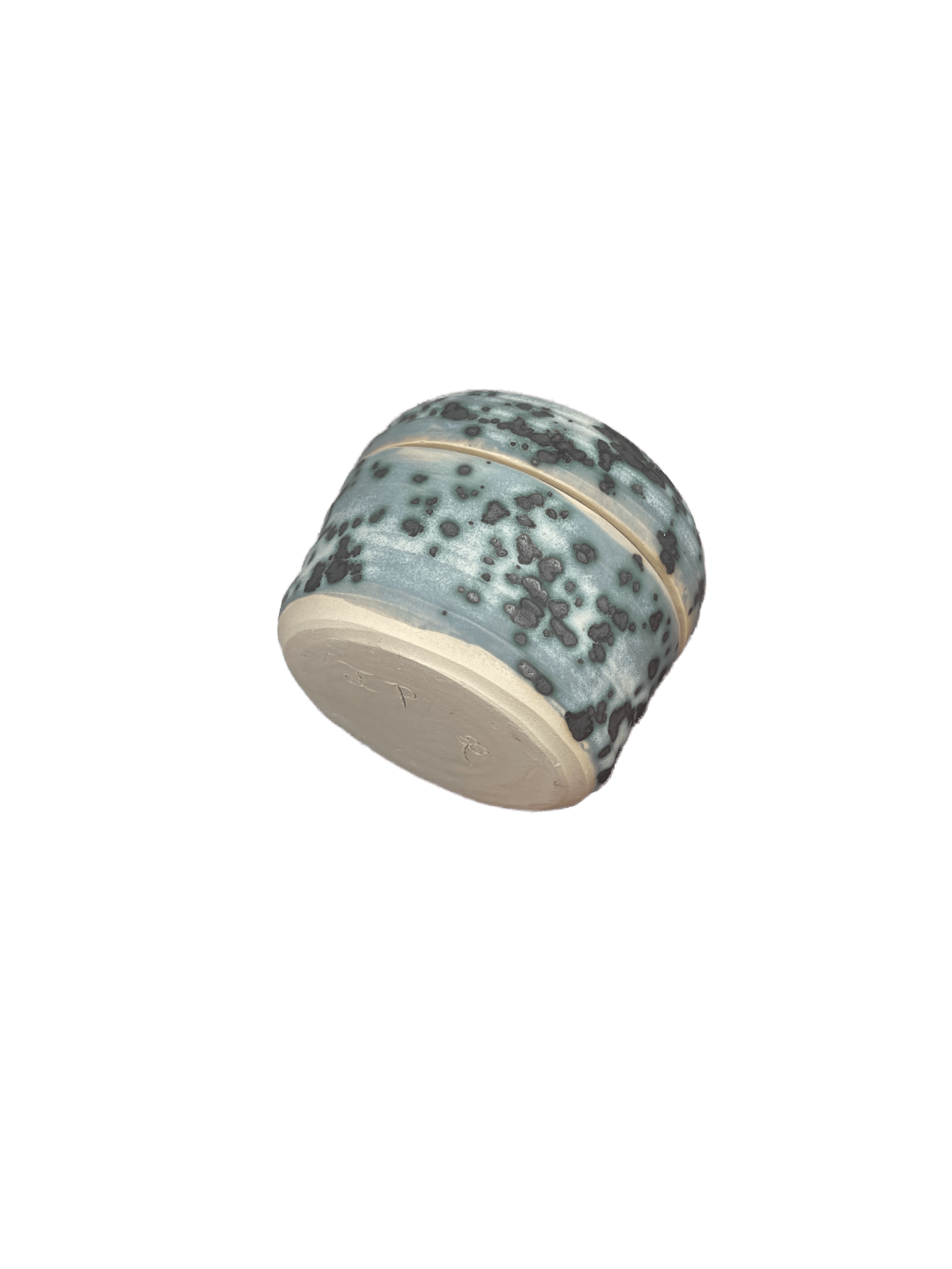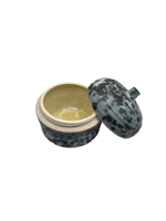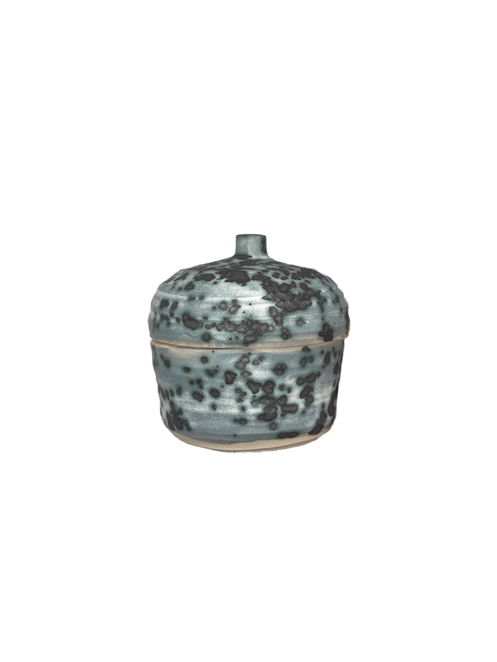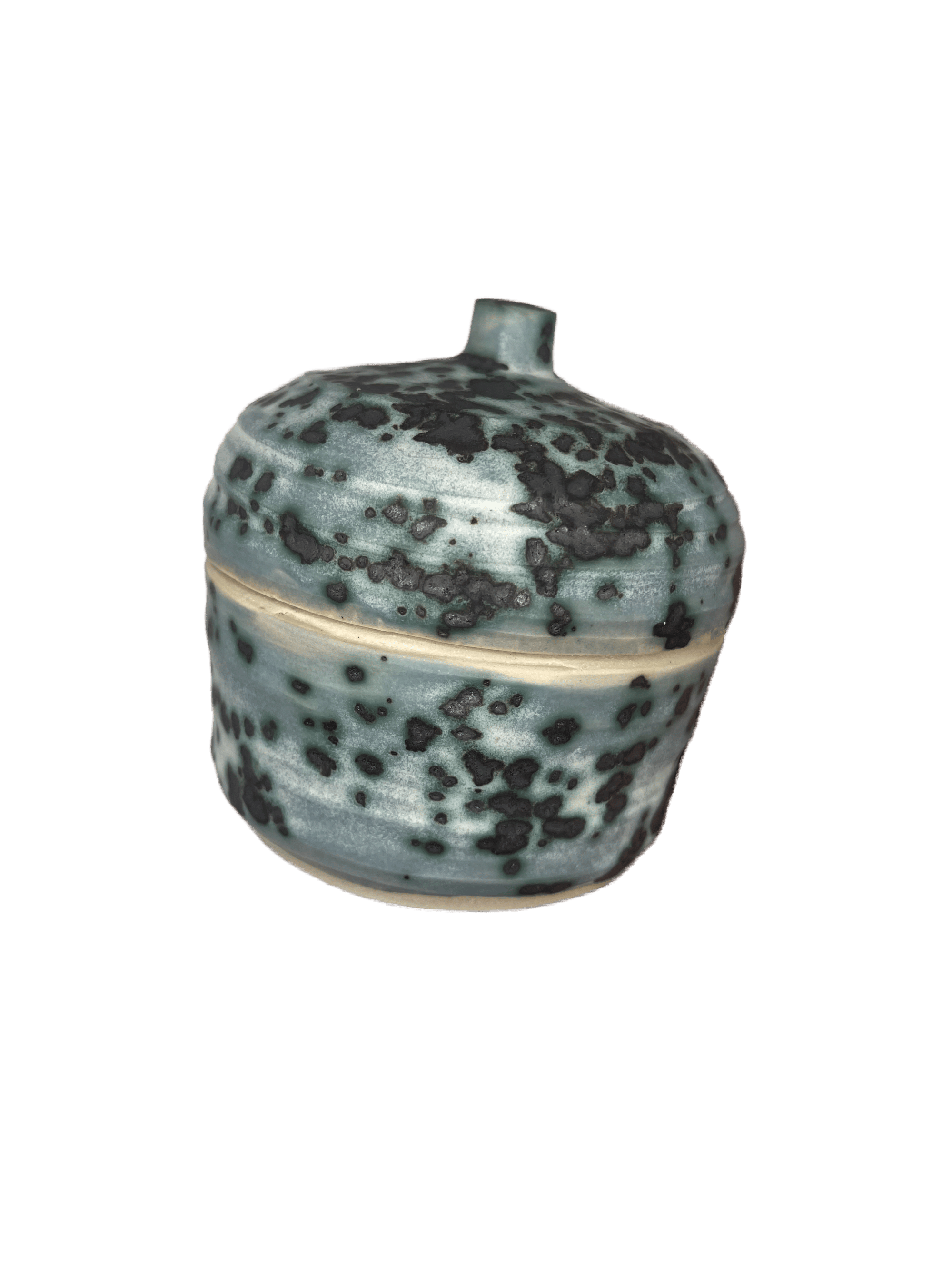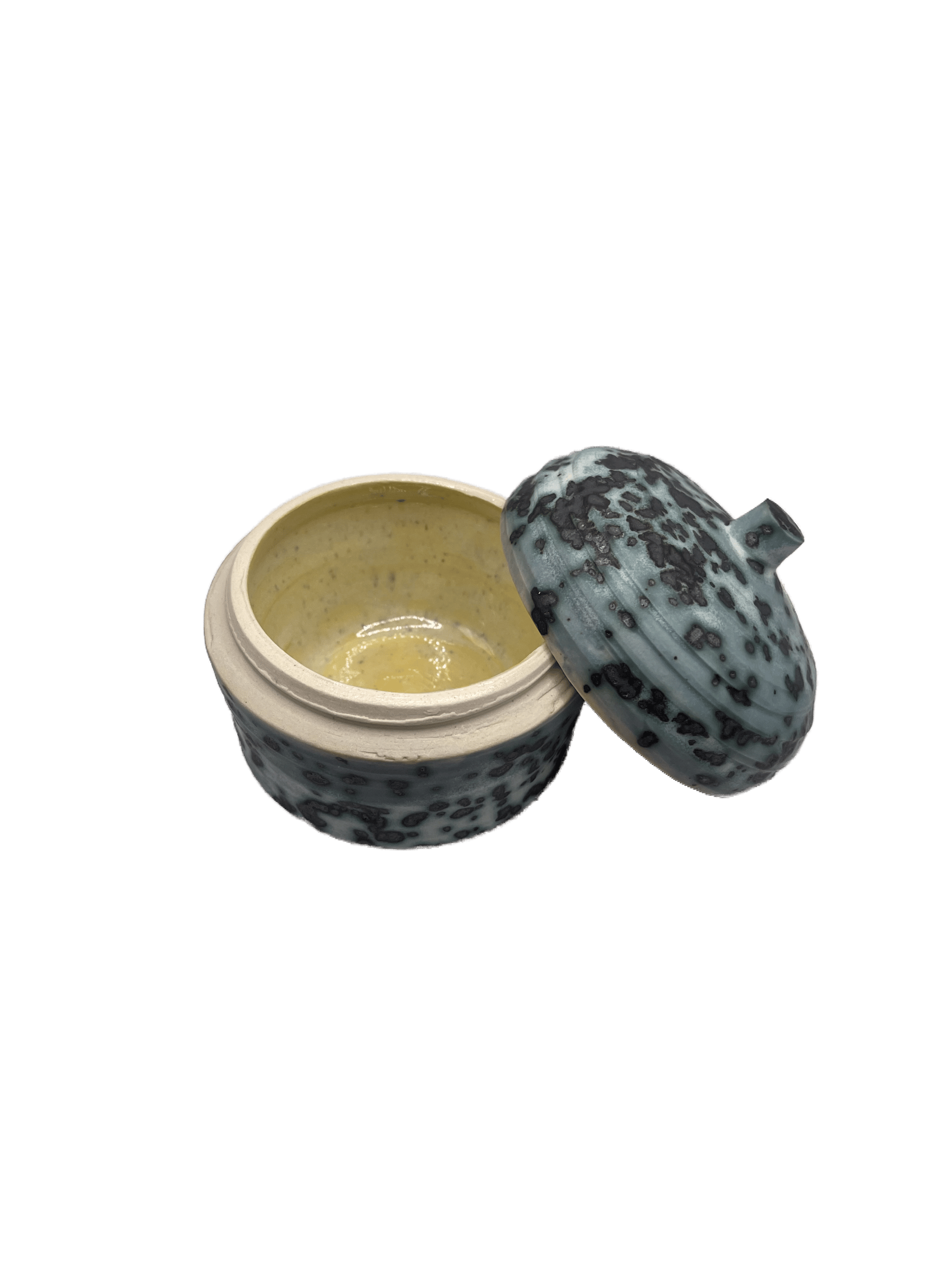 one of a kind stoneware jar with medium gray blue glaze mottled with black crystals, resembling mold like spores ๐ค ๐ ๐ ถ insides is glazed with a glossy yellow glaze